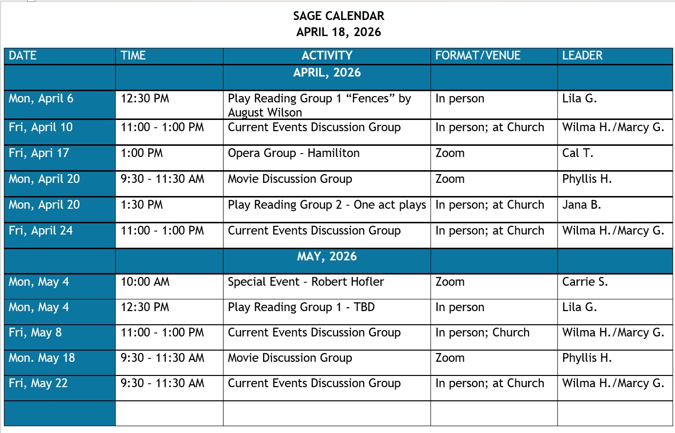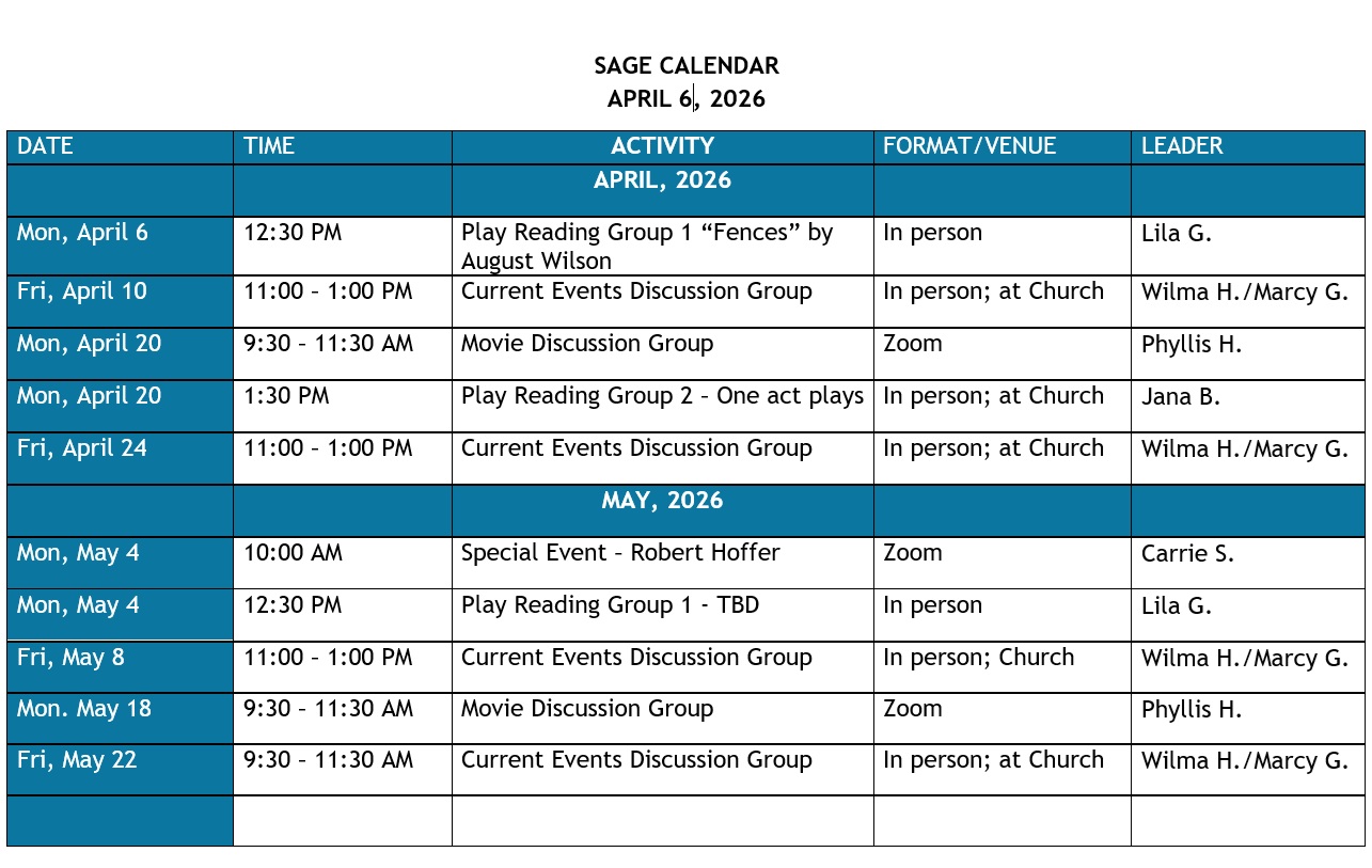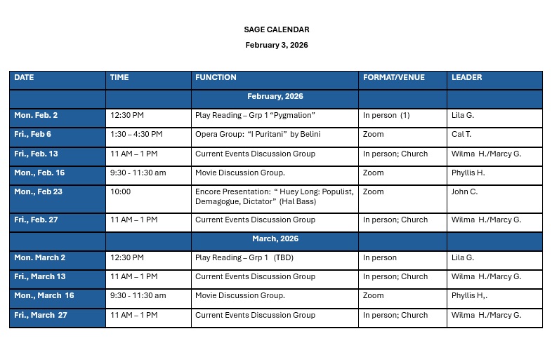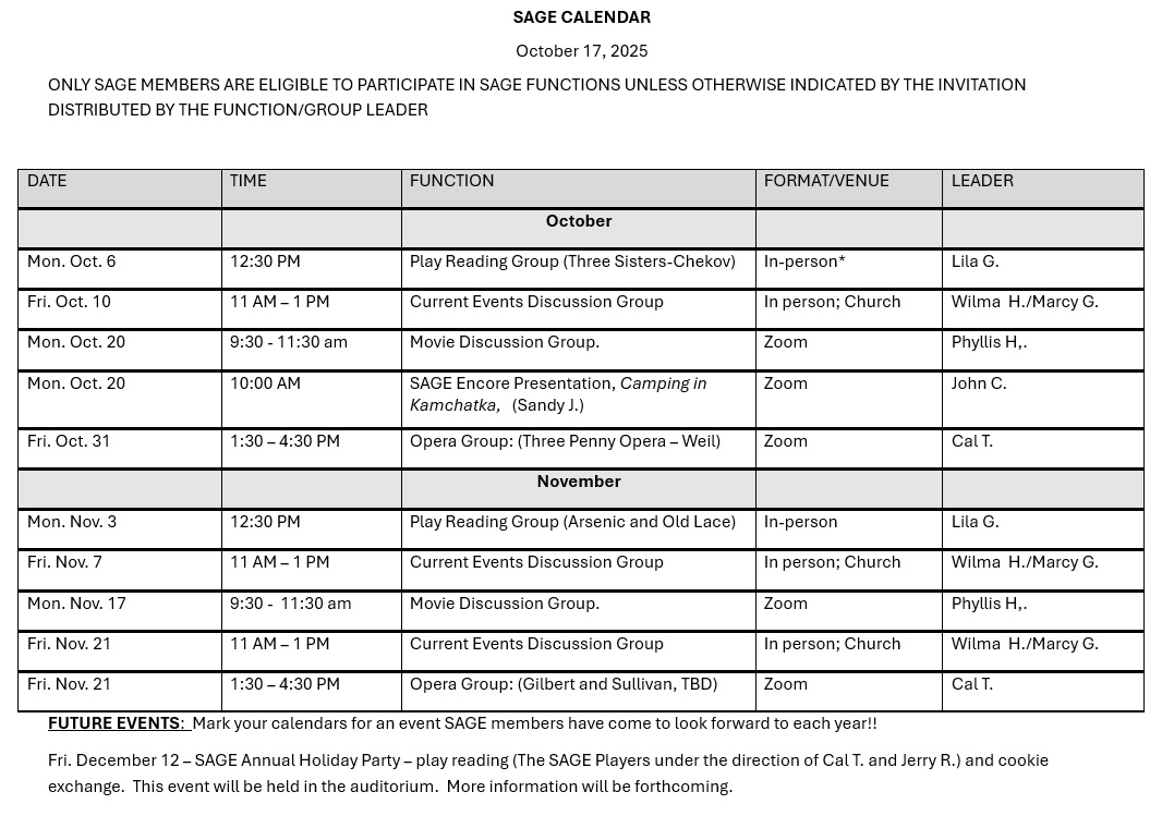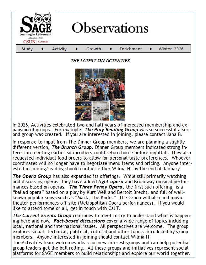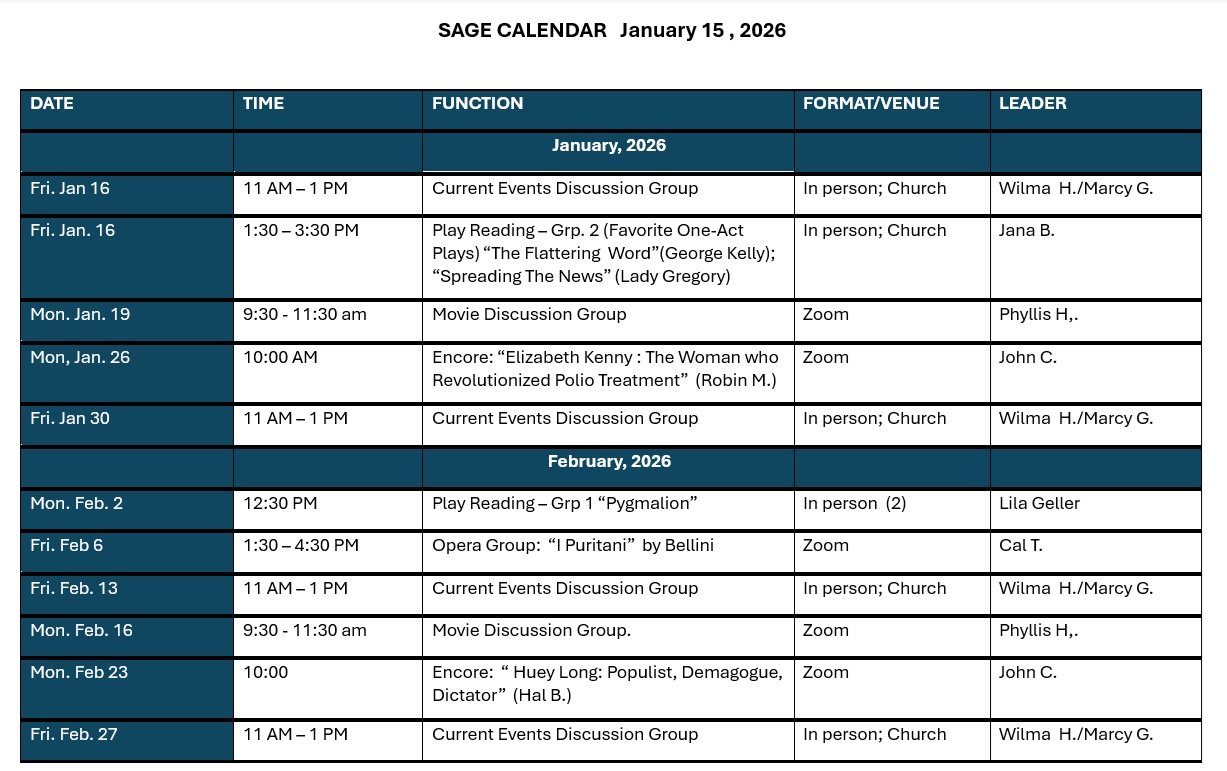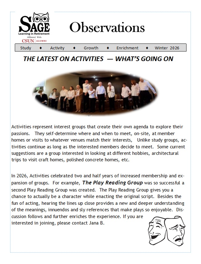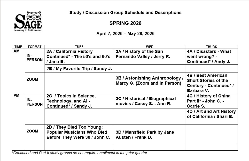 SAGE is a membership-supported community of retired and semi-retired people who share great curiosity about the world and a commitment to life-long learning. To help satisfy those needs, our organization offers classes, structured like small study groups, on a broad mix of subjects with four terms each year. Class members select, research, share information, and lead casual, highly interactive discussions on topics related to the class’s overall subject.
