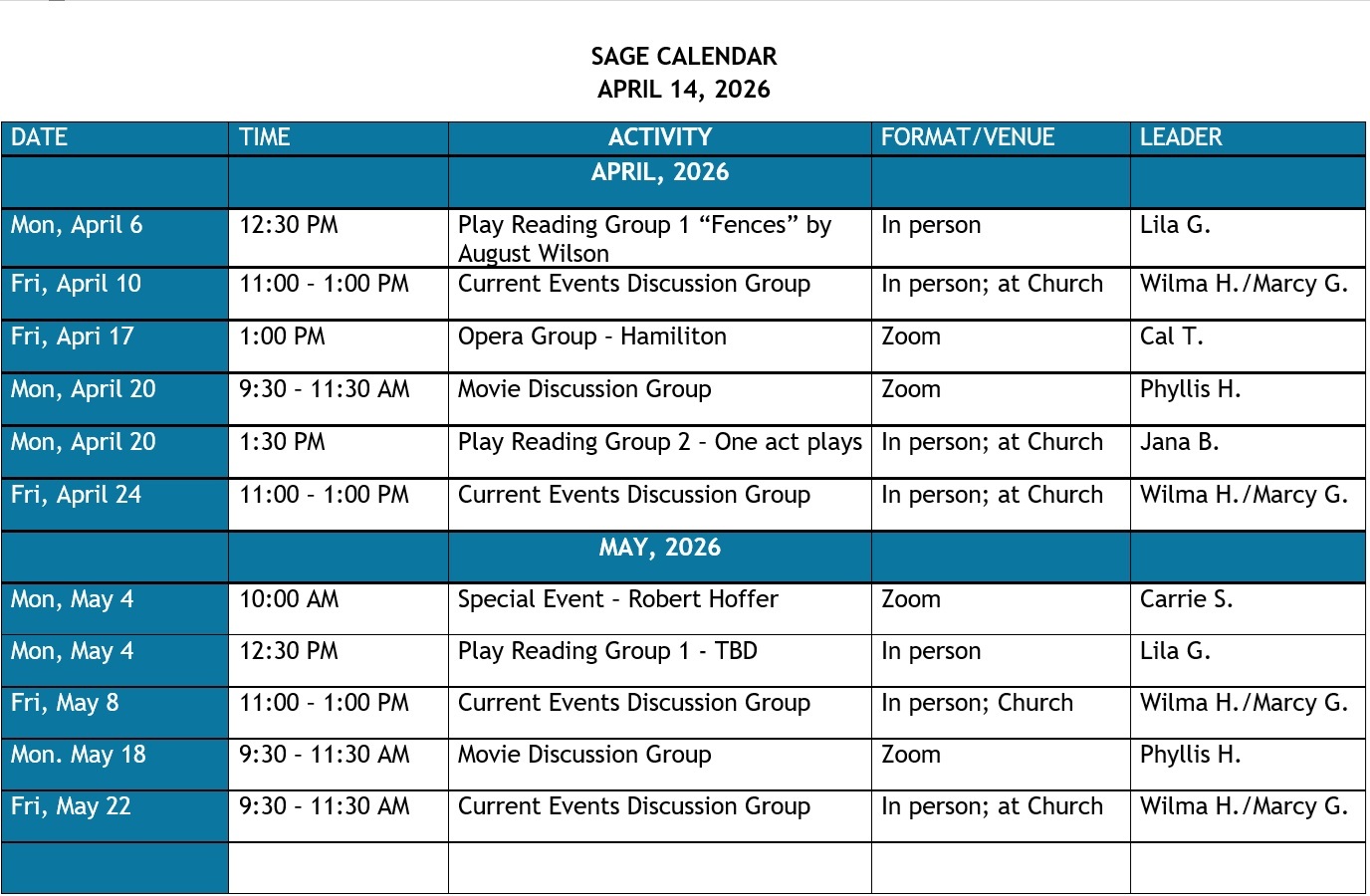 SAGE is a membership-supported community of retired and semi-retired people who share great curiosity about the world and a commitment to life-long learning. To help satisfy those needs, our organization offers classes, structured like small study groups, on a broad mix of subjects with four terms each year. Class members select, research, share information, and lead casual, highly interactive discussions on topics related to the class’s overall subject.